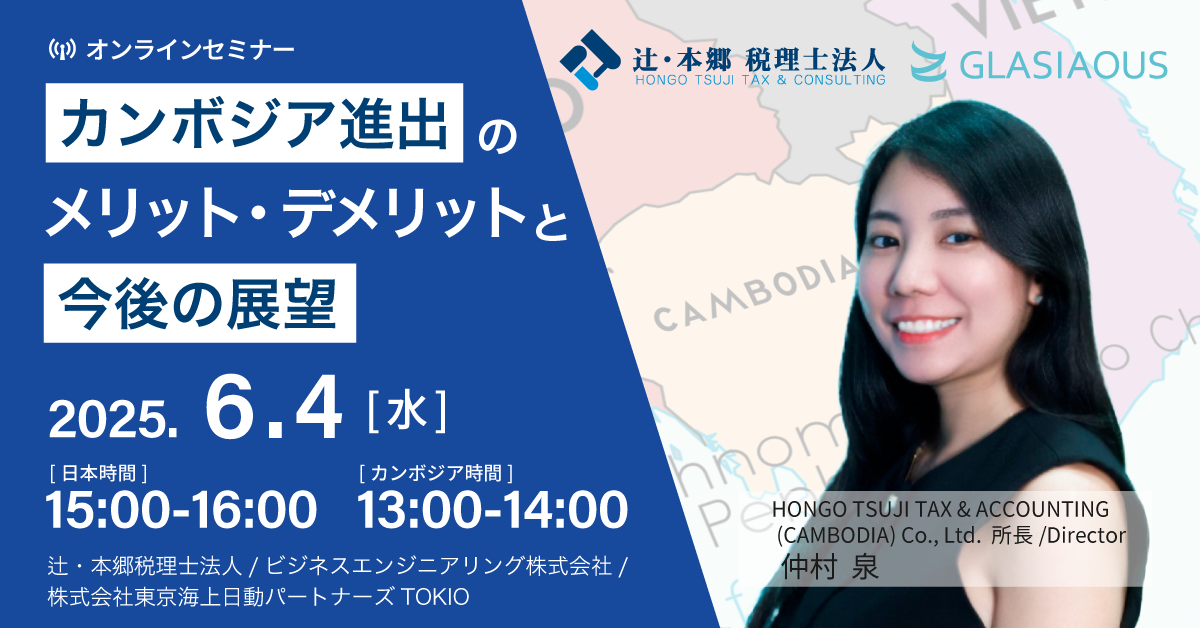 | テーマ | 近年、ASEAN諸国の中でも注目を集めているカンボジア。若年層人口の多さ、安定した経済成長、外資規制の緩さといった魅力により、製造業をはじめとする多くの企業が進出しています。一方で、税務・法務・インフラ等における課題も指摘されています。 本セミナーでは、実際に進出支援を行っている立場から、カンボジアにおける投資・事業展開のメリットとデメリットを整理し、さらに現地企業が抱える期待とニーズ、そして今後見込まれる成長分野や需要についても、最新情報を交えて解説いたします。 カンボジア進出をご検討中の企業様、情報収集段階の方、現地展開の見直しをお考えのご担当者様などにおすすめの内容です。ぜひご参加ください。 |
