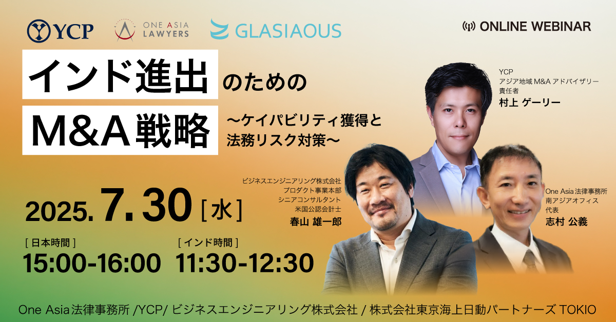 本セミナーでは、インド進出において企業が直面するM&A実行の課題を戦略・法務・ITの領域から解説します。外資企業のM&A成功パターンを分析し、インド特有のバリュエーション手法や地域的特性を踏まえた戦略策定法に加え、インドの法制度に基づく法的リスク管理と契約交渉のポイントを詳説。さらに、PMIフェーズにおけるITシステムの活用法まで、M&A実行における各プロセスを三領域の専門家が解説します。 |