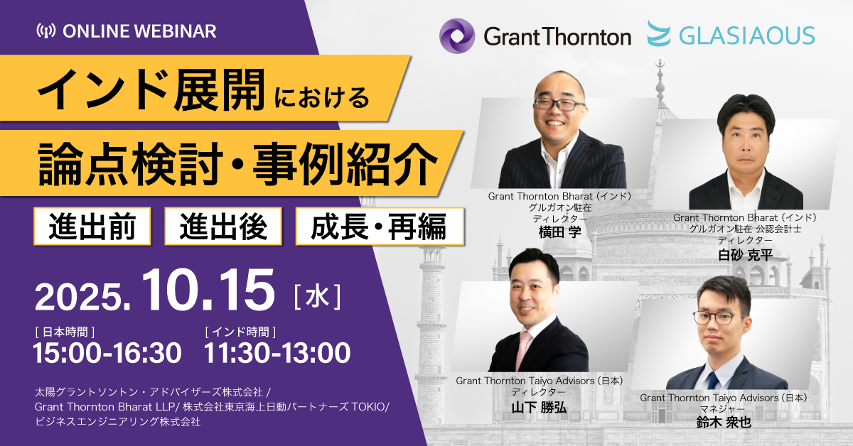 Grant Thornton Bharat(インド) グルガオン駐在 ディレクター 横田 学 一橋大学卒業後、総合商社にて財務・経理業務、その後、Big4系TASにて事業再生アドバイザリーに従事。米国・オランダ留学を経て、ドイツ・日本を拠点に複数の事業会社にて、欧州・アジアでのM&Aに関する戦略立案から実行、PMI、新規事業企画・開発までを担当。 2022年5月より太陽グラントソントン・アドバイザーズ勤務、海外子会社ガバナンス・リスク管理構築支援、M&A/PMIのPMO支援、経営企画支援等を担当。 2024年8月からメンバーファームである現職へ出向 ファイナンス専攻MBA、米国・EU法学修士(LLM)、日本証券アナリスト協会検定会員(CMA)、国際公認投資アナリスト(CIIA)。