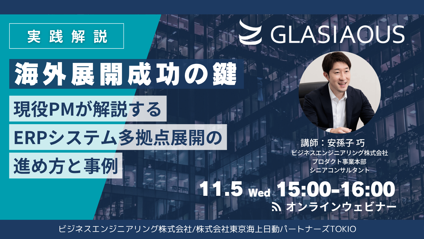 プロダクト事業本部 シニアコンサルタント 安孫子 巧 2008年ビジネスエンジニアリング入社。約5年間にわたりSAPの会計領域の導入や保守に従事。2013年よりGLASIAOUS(グラシアス)の基盤となる国際会計&ERPアプリケーションのシステム導入コンサルタントとして、多くの海外案件を担当。現在はプロジェクトマネージャー兼製品コンサルタントとして、お客様の課題解決に従事している。 |