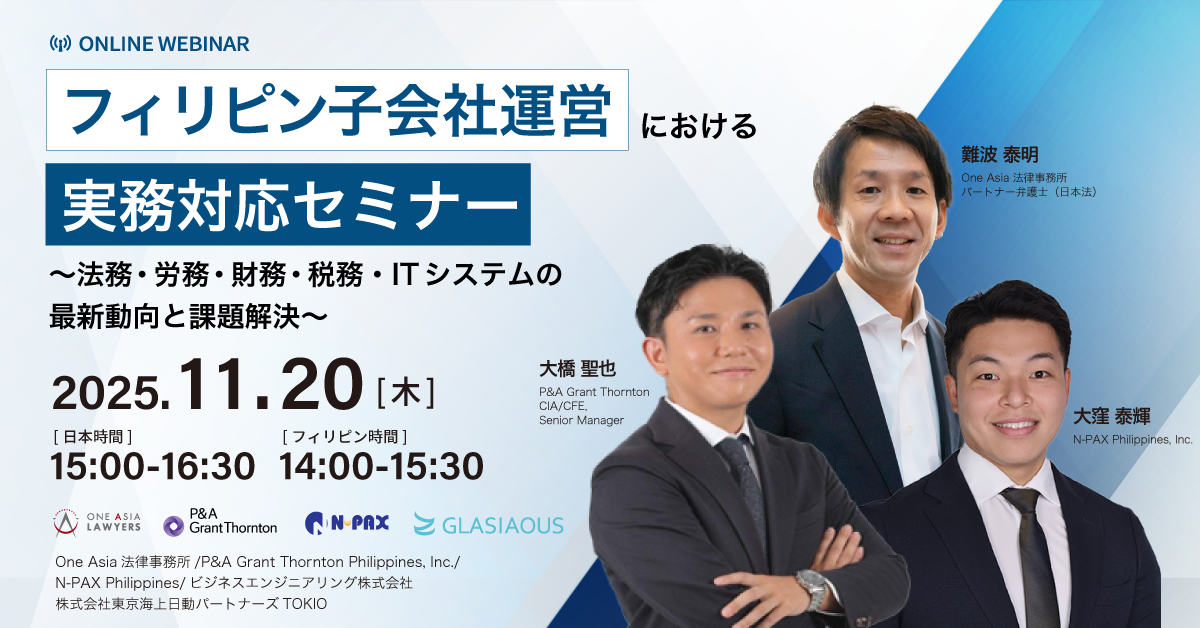 フィリピンでの事業運営において、法改正への対応や税務リスクの管理、システム整備は企業にとって重要な課題です。本セミナーでは、各分野の専門家がそれぞれの最新動向と実務対応策をご紹介いたします。 |