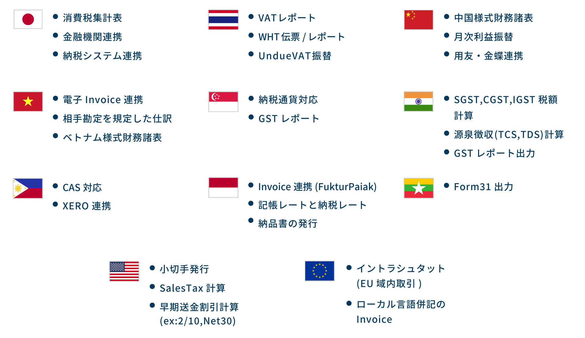 インドネシアでは、伝票計上時にWHT(源泉徴収税)を計上し、前受金や前払金の受領時にVAT(付加価値税)を計上することが一般的です。GLASIAOUSでは、VAT(PPN) / WHT(PPH)といった税計上に対応しています。